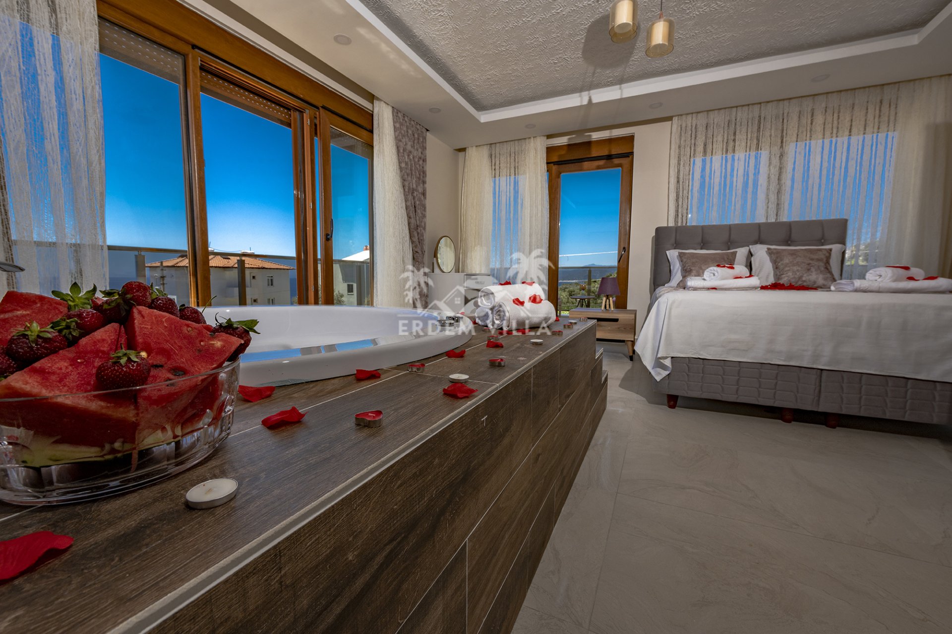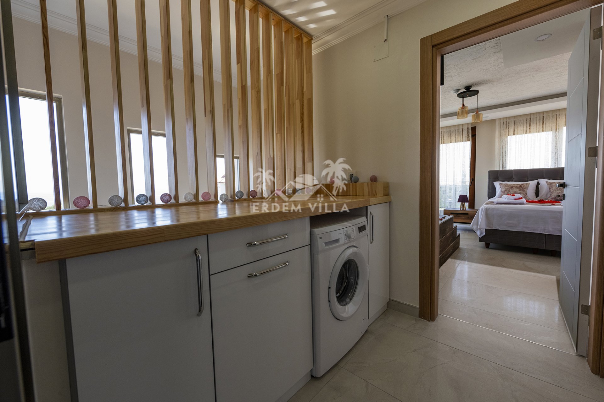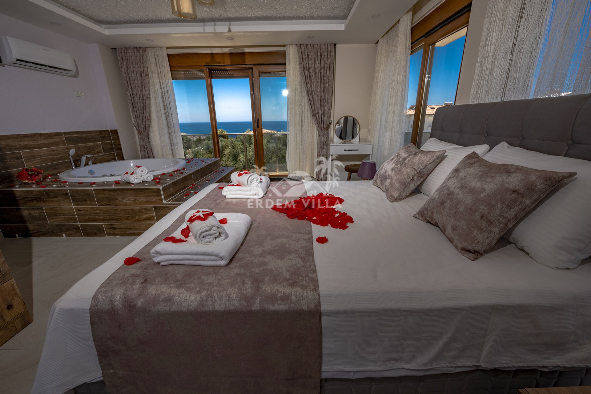 Çift kişilik yatak, banyo, TV, iki komodin, elbise dolabı, makyaj masası bulunan ilk yatak odası, jakuziye de sahip. İkinci yatak odası, jakuzi hariç aynı ürünleri barındırırken; üçüncü yatak odasında üç kişilik tek yatak, komodin, elbise dolabı ve klima bulunuyor. Çamaşır makinesi, ütü masası, buzdolabı, yemek masası, oturma grubu, sehpa ve bir evde bulunması gereken her türlü eşyayla donatılmış bu villa, misafirlerine konforlu ve lüks bir tatil imkânı tanıyor.